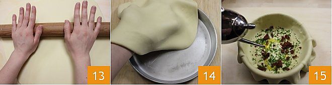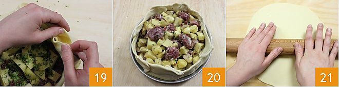 Bildet Falten, indem Sie die überschüssigen Teiglappen über die gesamte Umfangslänge überlappen (19-20). Decken Sie es mit einem feuchten Tuch ab, damit der Teig nicht austrocknet, und halten Sie es bereit. Rollen Sie inzwischen den kleineren Teigkloß zu einem runden Teig 21 mit einem Durchmesser von 21 cm und einer Dicke von etwa einem halben cm aus (dies wird der Deckel der Panada sein).