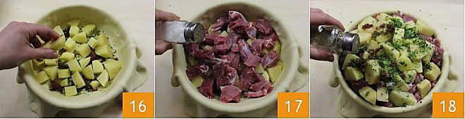 bedecken Sie mit der Hälfte der Kartoffeln 16 und der Hälfte der Lammstücke, salzen und pfeffern Sie, fügen Sie noch etwas von der Petersilie, den getrockneten Tomaten, Knoblauch, Salz und Pfeffer hinzu 17. Dann machen Sie eine weitere Schicht mit den restlichen Kartoffeln und Lammfleisch, vervollständigen Sie mit Petersilie, Tomaten und gehacktem Knoblauch, Salz, Pfeffer 18 und, wenn Sie möchten, beträufeln Sie mit einem Schuss Öl.
