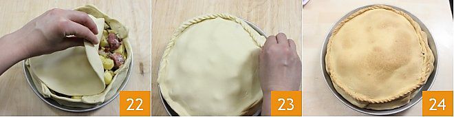 Legen Sie den runden Teig in die Mitte der Panada 22 und versiegeln Sie die Ränder sorgfältig mit den Fingern, indem Sie den Teig kneifen. Sobald Sie den Teig gut geschlossen haben, können Sie ihn mit dem typischen Zopf verzieren, den Sie bilden, indem Sie den Teig zwischen Daumen und Zeigefinger kneifen 23. Fahren Sie so um den ganzen Umfang fort. Backen Sie in einem bereits vorgeheizten statischen Ofen bei 200° für 30 Minuten und dann bei 180° für etwa 1 Stunde. Die Panada ist fertig 24, wenn Sie sie bewegen und den Saft der freigesetzten Fleischstücke im Inneren hören können. Nehmen Sie sie aus dem Ofen, lassen Sie sie abkühlen und aus der Form nehmen. Schneiden Sie den oberen Teil ab und servieren Sie die Panada heiß!