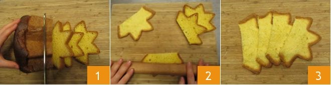 Um die Pandoro-Cannoli mit Nutella® herzustellen, schneiden Sie 8 Scheiben von je 1 cm Dicke aus einem halben übrig gebliebenen Pandoro (entfernen Sie dabei die Kuppel) 1. Drücken Sie sie leicht mit einem Nudelholz, um sie auf eine Dicke von 0,5 cm zu bringen (2-3).