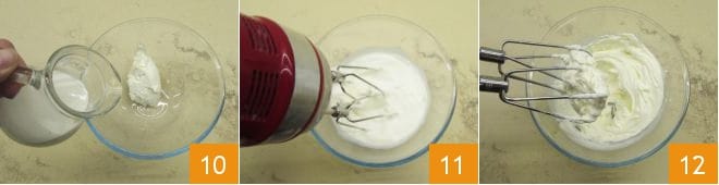 In der Zwischenzeit bereiten Sie die Creme zu: Geben Sie den Mascarpone und die frische Sahne in eine Schüssel 10, schlagen Sie sie mit einem elektrischen Handrührgerät 11, bis eine schaumige Masse entsteht 12.