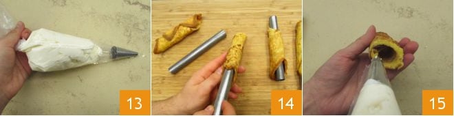 Geben Sie die Creme in einen Spritzbeutel mit Sterntülle 13. Nehmen Sie die Cannoli wieder, ziehen Sie sie vorsichtig vom Rohr ab 14 und füllen Sie sie zuerst mit der Mascarpone-Creme, indem Sie sie von einer Seite aus hineindrücken 15