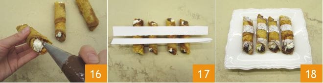 und dann mit Nutella®, ebenfalls mit Hilfe eines Spritzbeutels, von der anderen Seite aus 16. Sobald alle Cannoli gefüllt sind, legen Sie sie auf ein Brett, legen Sie darüber Papierstreifen 17 und bestäuben Sie sie mit Puderzucker, um ein Streifenmuster zu erhalten. Die Pandoro-Cannoli mit Nutella® sind bereit zum Genießen 18!