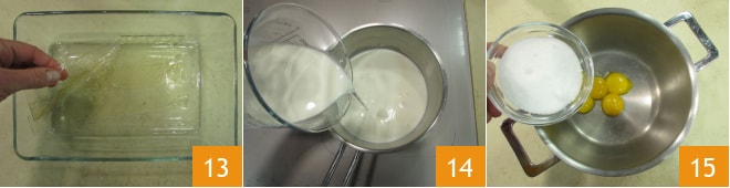 In der Zwischenzeit widmen Sie sich der Creme. Weichen Sie die Gelatine in kaltem Wasser ein, sie sollte es vollständig aufnehmen 13, und während sie weich wird, geben Sie Sahne und Milch in einen Topf 14 und bringen sie zum Kochen. In einem anderen Topf geben Sie die Eigelbe mit dem Zucker 15,