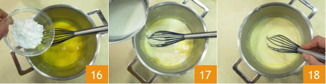 beginnen Sie zu rühren und fügen dann die Maisstärke hinzu 16. Gießen Sie die nun heiße Sahne und Milch langsam ein 17, um eine glatte Mischung zu erhalten 18.