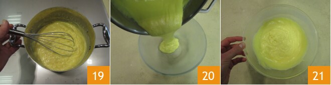 Stellen Sie den Topf auf den Herd. Kochen Sie unter ständigem Rühren mit einem Schneebesen, bis Sie eine glatte Creme erhalten 19. Dann in eine Schüssel umfüllen, die Sie vorher im Gefrierschrank gekühlt haben 20, und rühren Sie ein paar Augenblicke, um die Temperatur der Creme zu senken 21.