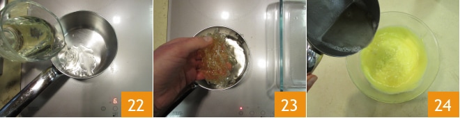 In der Zwischenzeit erhitzen Sie in einem Topf den Sekt 22, dann nehmen Sie die Gelatine, geben sie in den Sekt und lösen sie bei ausgeschalteter Flamme auf 23. Geben Sie sie in die Creme 24.