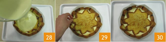 Gießen Sie die Creme in die Pandoro-Hülle 28, legen Sie die letzte getoastete Pandoro-Scheibe darauf (falls nötig, schneiden Sie die Zacken mit einer etwas kleineren Form als die Form aus) 29, drücken Sie sie vorsichtig auf die Creme, um sie zu verdichten. Lassen Sie sie im Kühlschrank für mindestens 4 Stunden fest werden 30.