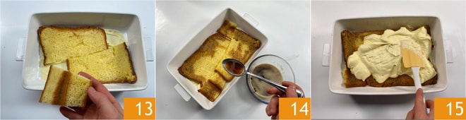 Legen Sie die Pandoro-Scheiben, bis der Boden vollständig bedeckt ist 13. Tränken Sie sie mit dem aromatisierten Kaffee 14. Tränken Sie sie nicht zu stark. Geben Sie die Hälfte der Creme darauf 15 und glätten Sie sie.