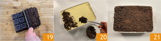 Hacken Sie die Schokolade 19 und bedecken Sie die Oberfläche nur damit 20 oder mit Kakao und Schokolade nach Belieben 21. Lassen Sie das Pandoro-Tiramisu eine Stunde im Kühlschrank fest werden, bevor Sie es servieren.