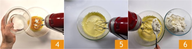 Mit denselben Quirlen beginnen Sie, die Eigelbe zu schlagen, und geben Sie nach und nach die restlichen 60 g Zucker hinzu 4, bis Sie eine helle Masse erhalten 5. Dann fügen Sie den Mascarpone nach und nach mit dem Handmixer hinzu. Sobald alles eingearbeitet ist, lockern Sie die Creme mit etwa der Hälfte der geschlagenen Eiweiße auf 6. Hier können Sie auch schnell mit einem Spatel mischen.