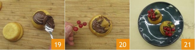 Garnieren Sie jedes Törtchen mit 15 g Nutella® 19, indem Sie es mit einem Teelöffel verstreichen. Fügen Sie etwas von der übrig gebliebenen Füllung, ein paar Johannisbeeren 20 und ein Minzblatt hinzu. Die Pandoro-Törtchen mit Äpfeln, Nüssen und Nutella® sind bereit, genossen zu werden 21.