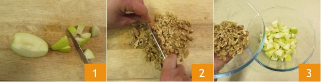 Um die Pandoro-Törtchen mit Äpfeln, Nüssen und Nutella® zuzubereiten, schmelzen Sie die Butter bei sehr niedriger Hitze und lassen Sie sie abkühlen. Waschen und trocknen Sie die Äpfel, halbieren Sie sie, entfernen Sie das Kerngehäuse und schneiden Sie sie dann in kleine, aber gleichmäßige Würfel, ohne sie zu schälen 1. Hacken Sie die Nüsse grob 2 und geben Sie sie zusammen mit den Äpfeln in eine Schüssel 3.