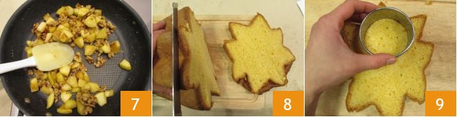 Sie sollten leicht karamellisiert sein 7. Schneiden Sie den Pandoro in dünne Scheiben, etwa einen halben Zentimeter dick 8. Stechen Sie 24 Scheiben mit einem Ausstecher von 7 cm Durchmesser aus 9.