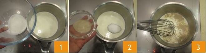 Um den Panettone-Kuchen mit Nutella® zuzubereiten, beginnen Sie mit der Dekoration aus getrockneten Orangen (die detaillierte Vorbereitung finden Sie auf unserer Website; diese Dekoration ist optional). Fahren Sie dann mit der Creme fort: Gießen Sie 50 g flüssige frische Sahne in einen kleinen Topf, fügen Sie den Zucker 1 und das Agar-Agar-Pulver 2 hinzu. Rühren Sie mit einem Schneebesen um 3 und bringen Sie es knapp zum Kochen.