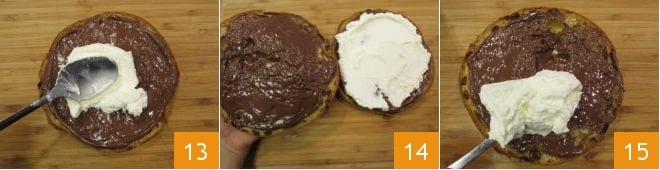 Dann 1/3 der Joghurtcreme darauf verteilen und gleichmäßig verteilen 13. Jetzt auch die zweite Scheibe mit der restlichen Nutella® bestreichen und auf die andere legen (die Seite mit Nutella® sollte oben bleiben) 13. Beenden Sie, indem Sie die gesamte Oberfläche mit der restlichen Joghurtcreme bedecken 15, mit einem Spatel für einen schneebedeckten Landschaftseffekt.