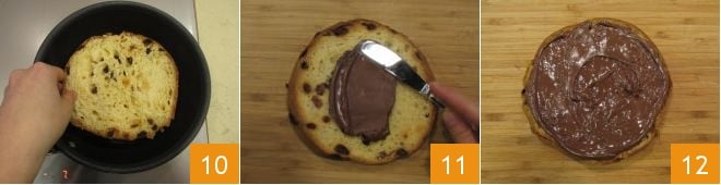 Zwei Scheiben Panettone in einer heißen Pfanne rösten 10, bis sie goldbraun sind. Nach der Ruhezeit die Creme aus dem Kühlschrank holen, um den Kuchen zusammenzustellen. Eine Scheibe Panettone mit der Hälfte der Nutella® bestreichen 11, gleichmäßig auf der gesamten Oberfläche verteilen 12.