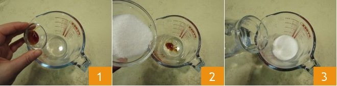 Um den Panettone zuzubereiten, beginnen Sie mit dem ersten Teig. Geben Sie in eine Schüssel den Malz 1, die 65 g Kristallzucker 2 und die 125 g Wasser bei Zimmertemperatur 3.