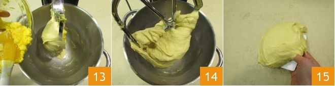 Um die Absorption zu erleichtern, lösen Sie mit einem Spatel den Teig, der an der Klinge der Maschine haften geblieben ist, und schalten Sie die Maschine erneut bei mittlerer Geschwindigkeit ein. Sobald der Teig gut trocken ist und die Butter vollständig absorbiert ist, fügen Sie den Rest der Emulsion aus Butter und Eigelb hinzu 13. Arbeiten Sie weiter, bis Sie einen glatten und homogenen Teig erhalten 14, dann geben Sie ihn auf eine Arbeitsfläche, indem Sie einen Teigschaber verwenden 15.