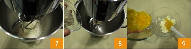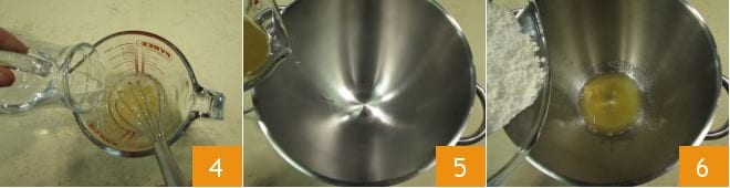 Rühren Sie mit einem Schneebesen, bis sich der Zucker aufgelöst hat 4; gießen Sie dann den Sirup in eine Küchenmaschine mit einem Flachrührer 5. Fügen Sie dann die 250 g Manitoba-Mehl auf einmal hinzu 6 und beginnen Sie zu kneten.