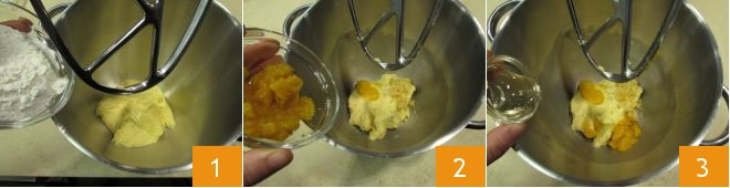 Für den zweiten Teig des Panettone lösen Sie den ersten (gegangenen) Teig mit einem Teigschaber von der Glasschüssel und geben Sie ihn in die Küchenmaschine, die immer noch mit dem Flachrührer ausgestattet ist. Fügen Sie 65 g Manitoba-Mehl hinzu 1 und starten Sie die Maschine bei moderater Geschwindigkeit, bis es vollständig absorbiert ist. Fügen Sie dann die aromatischen Massen hinzu, nämlich die Orangenpaste, die Mandarinenpaste und die Zitronenpaste 2; fügen Sie dann den Honig hinzu 3