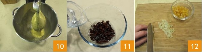 und arbeiten Sie den Teig bis er gut verbunden ist 10. In der Zwischenzeit weichen Sie die Rosinen ein 11 und schneiden Sie sowohl die Zitronat- als auch die kandierten Orangen in kleine Würfel 12.