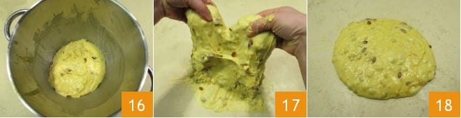 Wenn die kandierten Früchte und Rosinen gut eingearbeitet sind, stoppen Sie die Maschine, lösen Sie den Flachrührer und lassen Sie den Teig etwa 20 Minuten in der Schüssel der Küchenmaschine ruhen 16, indem Sie ihn mit einem Küchentuch abdecken. Dann geben Sie ihn auf eine Fläche, falten Sie ihn ein paar Mal 17 und lassen Sie ihn für weitere 30 Minuten bei Raumtemperatur ruhen 18; es ist nicht notwendig, ihn abzudecken. Keine Sorge, wenn der Teig etwas klebrig ist, helfen Sie sich mit einem Teigschaber, um ihn zu bearbeiten.