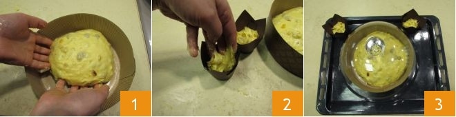 Nach 30 Minuten nehmen Sie 1050 g Teig, runden ihn vorsichtig, um ihm eine kugelförmige Gestalt zu geben, und geben ihn in eine 1 kg Papierform (die genauen Maße sind 22 cm Durchmesser und 8 cm Höhe) 1. Verwenden Sie den restlichen Teig (ca. 150 g), um zwei kleine Panettoncini mit Muffinformen zu backen 2. Heizen Sie den Ofen auf 35 °C vor, dann schalten Sie ihn aus, decken Sie den Panettone mit einer Glasglocke ab 3 und lassen Sie den Panettone und die Panettoncini für 6-8 Stunden im Ofen gehen.