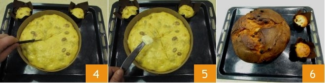 Wenn er aufgegangen ist, lassen Sie ihn für etwa 30 Minuten bei Raumtemperatur unbedeckt, so dass sich eine dünne Haut auf der Oberfläche bildet. Schneiden Sie mit einem Messer ein Kreuz ein 4 und legen Sie ein Butterstück in die Mitte des Kreuzes 5. Backen Sie bei 175 °C im Umluftmodus für 50 Minuten, nach 20-25 Minuten nehmen Sie die kleinen Panettoni heraus und setzen Sie die Backzeit für den Panettone fort. Dann nehmen Sie ihn heraus