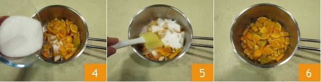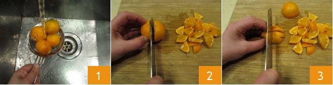 Wenn Sie möchten, können Sie die Pasta der verschiedenen Zitrusfrüchte zu Hause herstellen. Um die Mandarinenpaste zu machen, waschen Sie sie zuerst 1 und entfernen Sie die Enden; dann schneiden Sie sie, ohne sie zu schälen, zuerst in Hälften 2 und dann in Scheiben, die Sie erneut halbieren 3.
