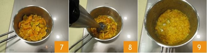 Zu diesem Zeitpunkt stellen Sie die Mischung auf den Herd und kochen sie bei niedriger Hitze für 35-40 Minuten 7. Sobald sie gekocht sind, lassen Sie sie abkühlen und pürieren Sie alles mit einem Stabmixer 8, bis Sie Ihre Mandarinenpaste erhalten 9.