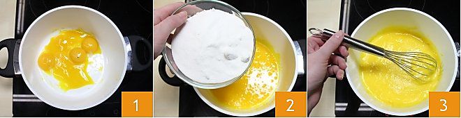 Um den Flan Parisien zuzubereiten, bereiten Sie zunächst die Creme für die Füllung vor: Geben Sie die 5 Eigelbe 1 in einen Topf und fügen Sie den Kristallzucker hinzu 2. Lassen Sie den Zucker bei sehr niedriger Hitze gut schmelzen, indem Sie mit einem Schneebesen rühren 3.