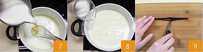 Fügen Sie nun die Milch bei Raumtemperatur nach und nach hinzu, während Sie stets mit einem Schneebesen rühren 7, sowie die Sahne 8. Schneiden Sie eine Vanilleschote der Länge nach auf und kratzen Sie mit der Messerspitze die Samen heraus 9.