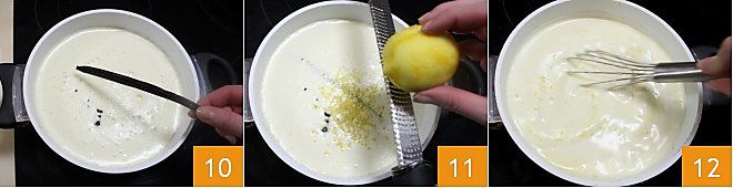 Geben Sie die Schote und ihre Samen in die Eier-Milch-Mischung 10 und reiben Sie schließlich die Schale einer halben Zitrone ab 11; lassen Sie die Masse bei niedriger Hitze unter ständigem Rühren mit einem Schneebesen 12 etwa 15 Minuten kochen oder bis sie eine cremige und kompakte Konsistenz erreicht hat, ähnlich wie bei einer Puddingcreme.