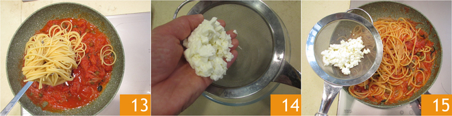 Stellen Sie die Hitze ab, lassen Sie die Spaghetti in die Soße abtropfen 13, rühren Sie um, dann lassen Sie den Fior di Latte gut abtropfen und ausdrücken 14, bevor Sie ihn zu den Nudeln geben 15.