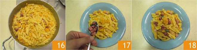 Die Pasta mit Kürbis und Speck ist fertig 16, die Teller mit dem zurückgehaltenen Speck garnieren 17 und heiß servieren 18.