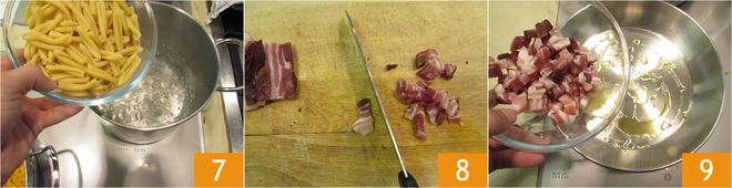 Kocht die Pasta al dente 7 und schneidet in der Zwischenzeit den Speck in Würfel 8. Gebt etwas Öl in eine Pfanne und fügt den Speck hinzu 9.