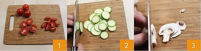 Um die Penne alla Crudaiola zuzubereiten, waschen und vierteln Sie die Kirschtomaten 1. Spitzen Sie die jungen Zucchini ab, waschen Sie sie und schneiden Sie sie in dünne Scheiben 2; schneiden Sie auch die schwarzen Oliven in Scheiben. Reinigen Sie die Champignons, indem Sie die Erde an den Stielen entfernen; schälen Sie die Köpfe der Pilze (ohne sie von den Stielen zu trennen) und schneiden Sie sie dann der Länge nach in dünne Scheiben 3.