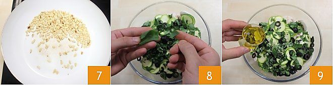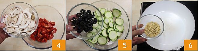 In einer Schüssel geben Sie die Kirschtomaten, die Pilze 4, die Zucchini und die Oliven 5 und stellen Sie sie beiseite. Rösten Sie die Pinienkerne in einer Pfanne bei schwacher Hitze 6,