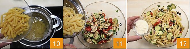 In der Zwischenzeit kochen Sie die Penne rigate bissfest 10, seihen Sie sie ab und geben Sie sie in die Schüssel, in der die zuvor zubereitete Soße ruht 11; mischen Sie die Zutaten gut mit einem Löffel und servieren Sie die Penne alla Crudaiola sofort, bringen Sie geriebenen Käse 12 wie Parmigiano, Grana oder Pecorino oder geräucherten Ricotta auf den Tisch; lassen Sie die Gäste nach Belieben bedienen.