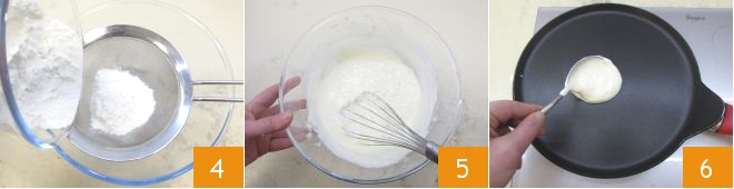 Um die Pfannkuchen ohne Butter zuzubereiten, beginnen Sie damit, das Ei in eine Schüssel zu geben und mit einem Schneebesen zu schlagen 1. Wenn es hell und schaumig ist, fügen Sie die Milch in einem dünnen Strahl hinzu 2 und schlagen Sie weiter, während Sie auch den Joghurt hinzugeben 3.