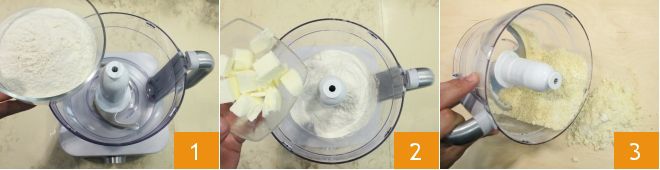 Um die pikante Torte zuzubereiten, beginnen Sie mit der Zubereitung des Mürbeteigs: Geben Sie im Mixer mit Klingen das Mehl 1, die kalte Butter in Stücken 2, eine Prise Salz und mixen Sie alles, bis Sie eine sandige und mehlige Masse erhalten. An diesem Punkt legen Sie die erhaltene Masse auf eine Arbeitsfläche 3