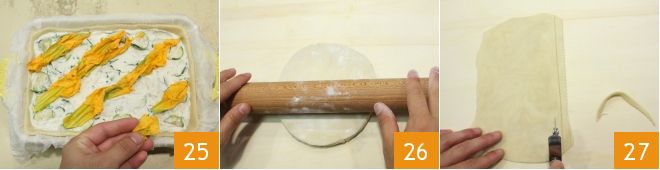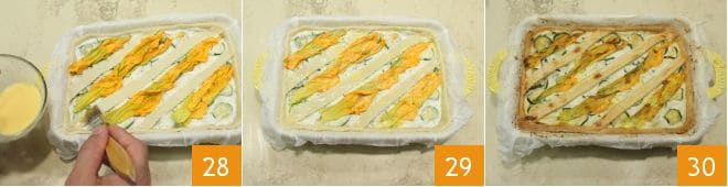Bringen Sie nun die erhaltenen Streifen auf der Oberfläche der Torte an, indem Sie der Linie der Zucchiniblüten folgen. Bestreichen Sie die Oberfläche der Torte mit einer Emulsion aus geschlagenem Ei und Milch (28-29) und backen Sie sie im vorgeheizten statischen Ofen bei 170 °C für 55 Minuten oder im Umluftofen bei 160 °C für 45 Minuten. Wenn die Torte goldbraun ist, nehmen Sie sie aus dem Ofen 30. Genießen Sie Ihre pikante Torte mit Ricotta und Zucchiniblüten lauwarm.
