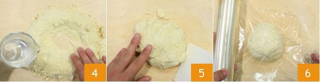 in klassischer Fontänenform 4 und kneten Sie alles schnell, indem Sie nach und nach das kalte Wasser hinzufügen, bis Sie einen kompakten und ziemlich elastischen Teig erhalten 5. Sobald der Teig fertig ist, wickeln Sie Ihren Mürbeteig in eine Küchenfolie 6 und lassen Sie ihn mindestens 40 Minuten im Kühlschrank ruhen.