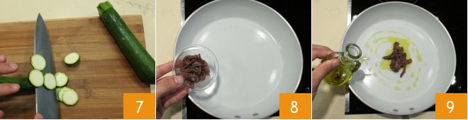 Widmen Sie sich nun der Füllung: Waschen und trocknen Sie die Zucchini, entfernen Sie die Enden, legen Sie die Blüten beiseite und schneiden Sie die Zucchini in Scheiben 7. Stellen Sie eine Pfanne auf den Herd, geben Sie die Sardellen hinein 8, bedecken Sie sie mit einem Schuss Öl 9,