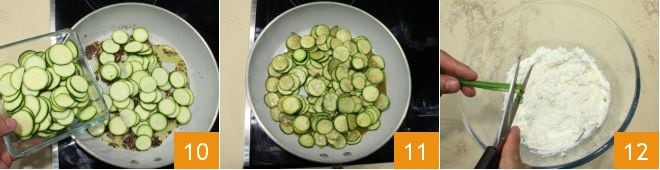 fügen Sie die Zucchinischeiben hinzu 10, salzen, pfeffern und braten Sie die Zucchini bei mittlerer Hitze einige Minuten an, sie sollten nicht vollständig garen, sondern leicht knusprig bleiben, lassen Sie sie abkühlen 11. In einer großen Schüssel geben Sie den Ricotta, fügen Sie 3-4 fein geschnittene Schnittlauchröllchen mit der Schere hinzu 12,