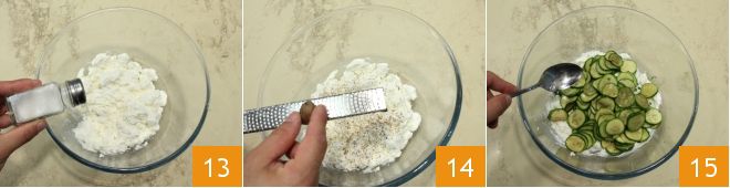 salzen 13, aromatisieren Sie mit einer Prise geriebener Muskatnuss 14. Fügen Sie die Zucchini hinzu und vermengen Sie die Mischung mit einem Löffel 15.
