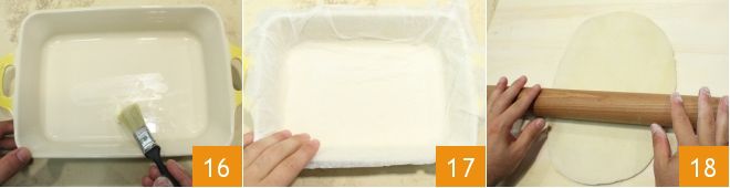 Nehmen Sie nun eine rechteckige Form von 25x18 cm, fetten Sie sie ein 16 und legen Sie sie mit einem Blatt Backpapier aus, das gut an den Rändern haftet 17. Nehmen Sie den Mürbeteigblock, nehmen Sie 2/3 des Teiges (wickeln Sie den restlichen Teig in Folie und bewahren Sie ihn im Kühlschrank auf), legen Sie ihn auf eine Arbeitsfläche und rollen Sie einen Teig von etwa 1 cm Dicke aus 18.