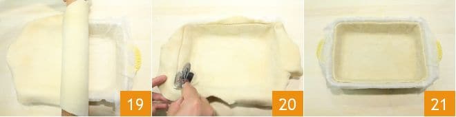 Wickeln Sie den Teig um das Nudelholz und rollen Sie ihn auf die Form 19, drücken Sie an allen Seiten und am Boden der Form, um den Teig haftend zu machen, entfernen Sie die überstehenden Ränder mit einem Teigrädchen (20-21).