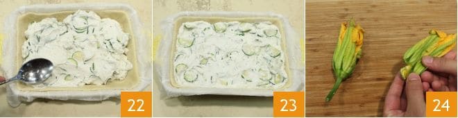 Geben Sie die Ricotta-Zucchini-Füllung in die Form, glätten Sie die Mischung mit der Rückseite eines Löffels (22-23), nehmen Sie die Zucchiniblüten, waschen Sie sie, indem Sie sie in eine Schüssel mit kaltem Wasser tauchen, trocknen Sie sie auf einem Küchentuch. Wenn sie trocken sind, entfernen Sie die Auswüchse, indem Sie die untere Tasse behalten, entfernen Sie den Stängel und den inneren Stempel 24.